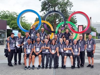 Les 16 arbitres FIVB, leurs coaches devant les anneaux olympiques